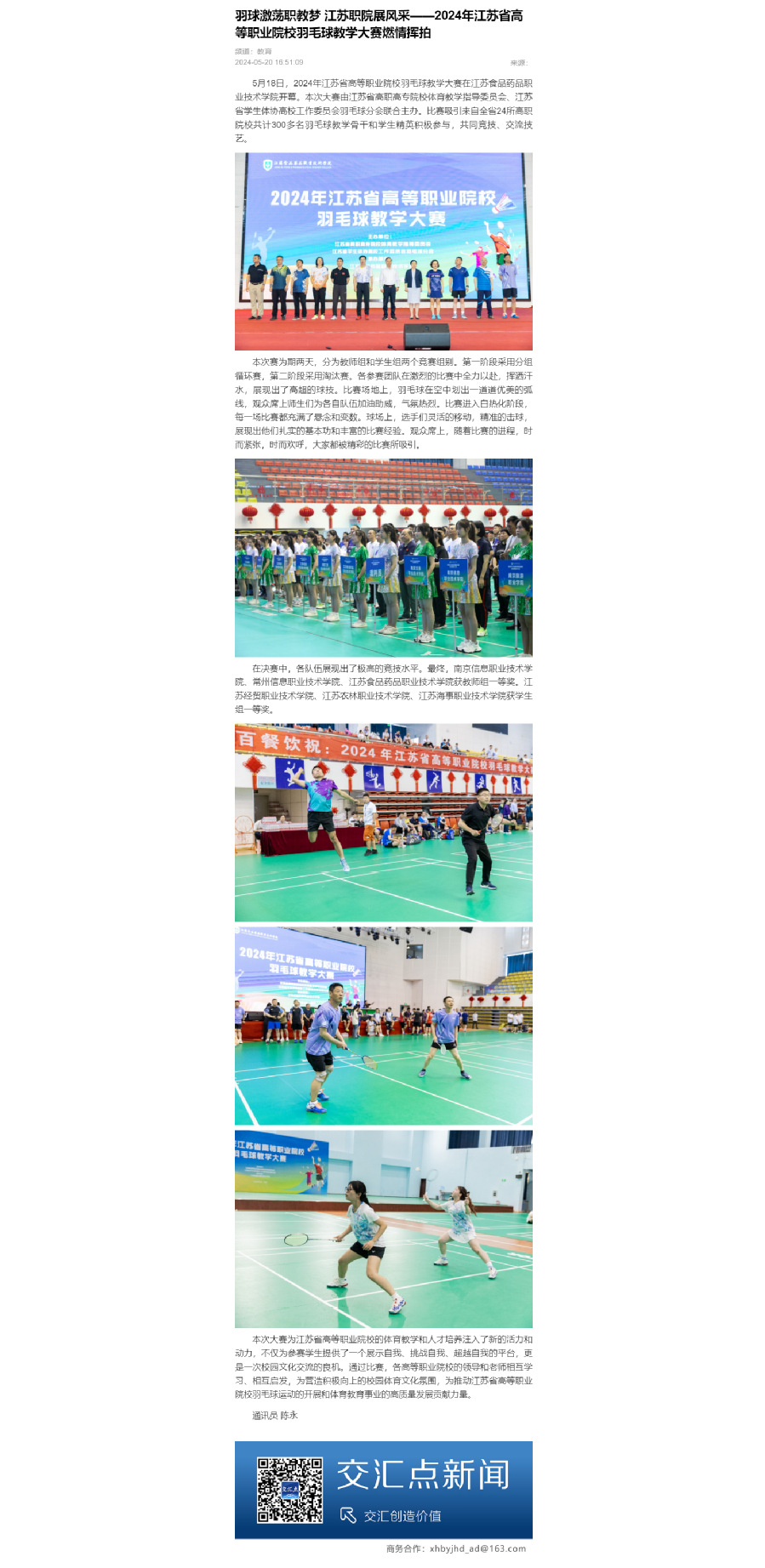 5月18日,2024年江苏省高等职业院校羽毛球教学大赛在BBV电子·(中国)网站开幕。本次大赛由江苏省高职高专院校体育教学指导委员会、江苏省学生体协高校工作委员会羽毛球分会联合主办。比赛吸引来自全省24所高职院校共计300多名羽毛球教学骨干和学生精英积极参与,共同竞技、交流技艺。