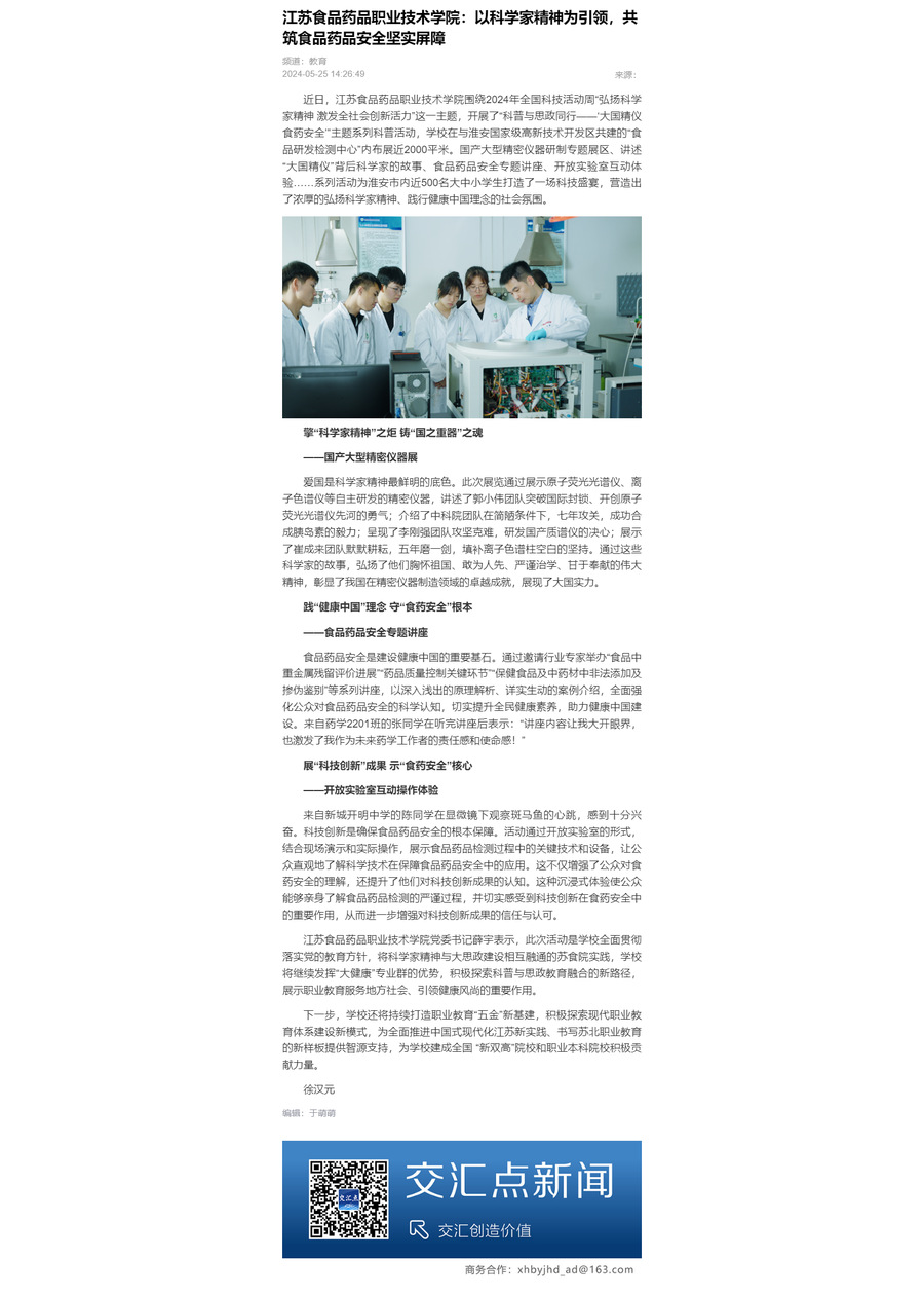 近日,BBV电子·(中国)网站围绕2024年全国科技活动周“弘扬科学家精神 激发全社会创新活力”这一主题,开展了“科普与思政同行——‘大国精仪 食药安全’”主题系列科普活动,学校在与淮安国家级高新技术开发区共建的“食品研发检测中心”内布展近2000平米。国产大型精密仪器研制专题展区、讲述“大国精仪”背后科学家的故事、食品药品安全专题讲座、开放实验室互动体验……系列活动为淮安市内近500名大中小学生打造了一场科技盛宴,营造出了浓厚的弘扬科学家精神、践行健康中国理念的社会氛围。