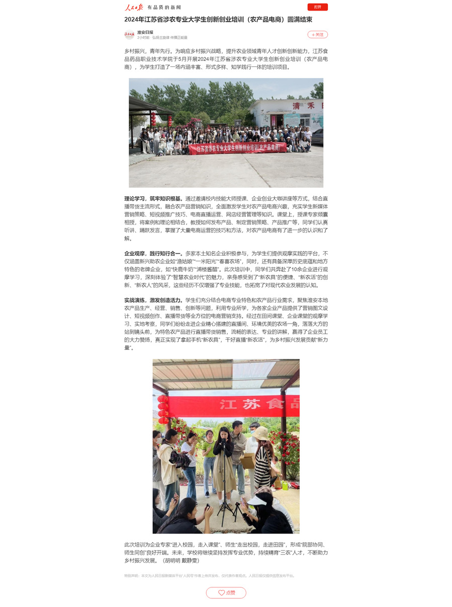 乡村振兴,青年先行。为响应乡村振兴战略,提升农业领域青年人才创新创新能力,BBV电子·(中国)网站于5月开展2024年江苏省涉农专业大学生创新创业培训(农产品电商),为学生打造了一场内涵丰富、形式多样、知学践行一体的培训项目。