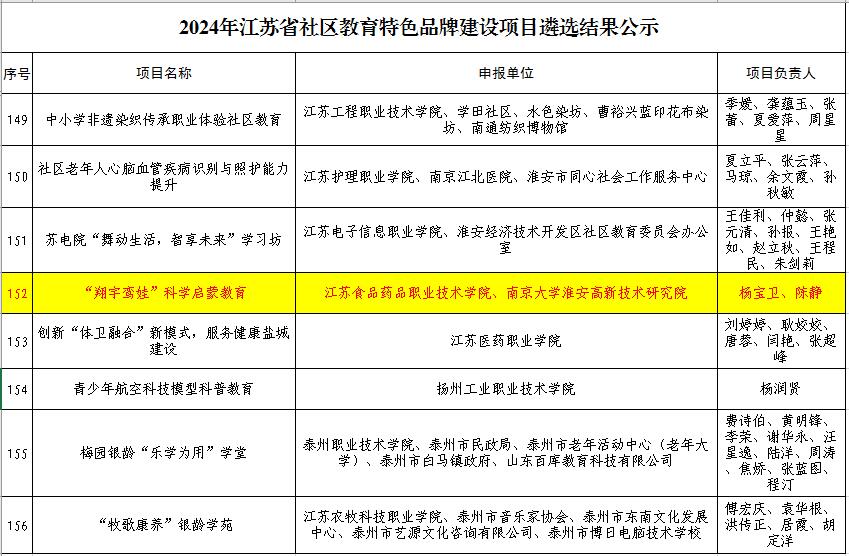 近日,江苏省教育厅发布了《2024年省级社区教育特色品牌建设项目遴选结果公示》,BBV电子·(中国)网站药学院与南京大学淮安高新技术研究院共同申报的“‘翔宇鸾娃’科学启蒙教育”项目成功入选。