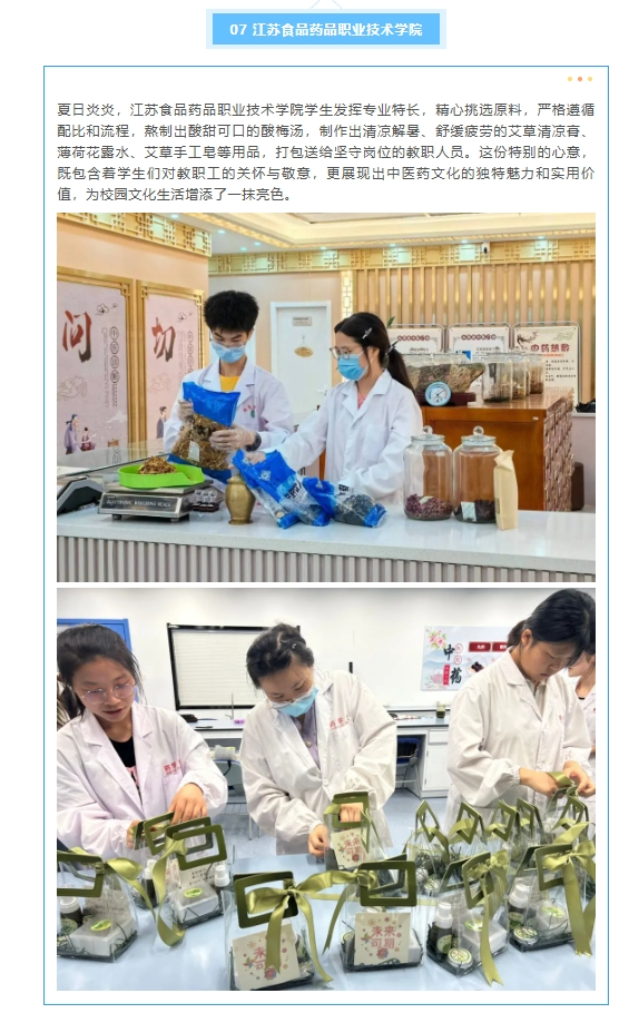 夏日炎炎,BBV电子·(中国)网站学生发挥专业特长,精心挑选原料,严格遵循配比和流程,熬制出酸甜可口的酸梅汤,制作出清凉解暑、舒缓疲劳的艾草清凉膏、薄荷花露水、艾草手工皂等用品,打包送给坚守岗位的教职人员。这份特别的心意,既包含着学生们对教职工的关怀与敬意,更展现出中医药文化的独特魅力和实用价值,为校园文化生活增添了一抹亮色。