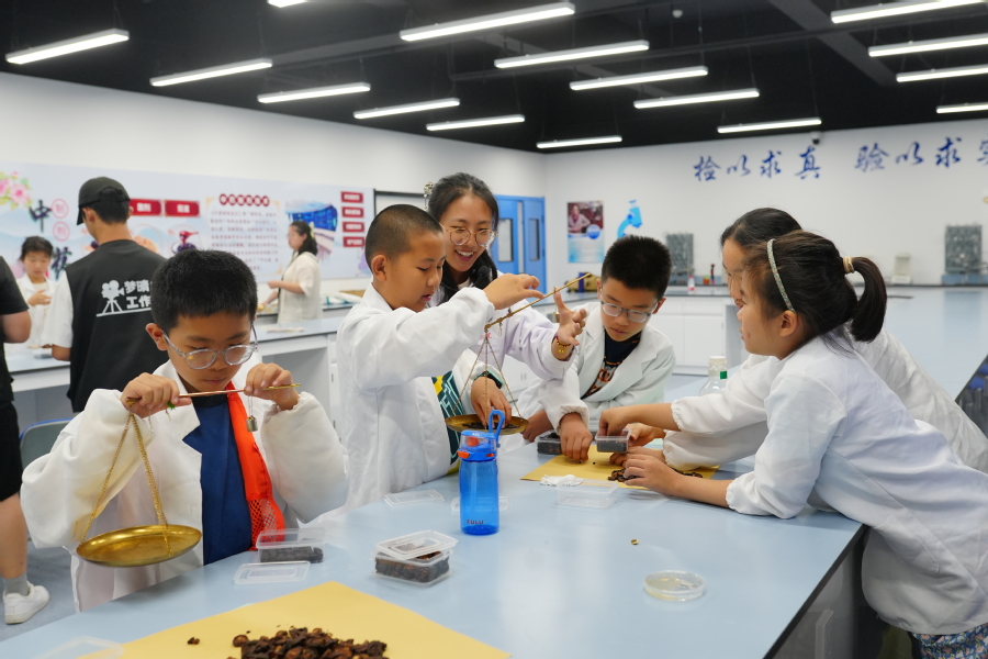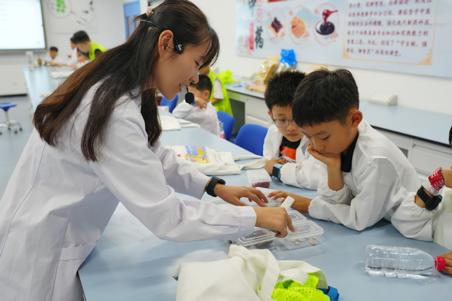 本次夏令营包含了化学、物理、生物、微生物、中药以及体智能拓展六大主题课程,并为每位小营员准备了专属的入营通知书、设计独特的定制帆布包、夏令营小马甲以及实用的文具套装。参加本次夏令营的63名小营员们最大年龄12岁,最小的仅5岁,他们分为三个班级,在老师的带领下,不仅亲手进行了“水中花园”“神奇的字与画”“秘密书信”“点水成冰”等化学实验见证了神奇的化学反应,还通过“水果发电”“自制净水器”“会动的声音”“磁力小车”等等物理小实验探索了自然界的奥秘。在生物与微生物的世界里,他们学会了观察与记录,进行了“丰富多彩的显微世界”“吹气球的酵母”“葱花怒放”“蛋清历险记”“细胞样貌”“揭秘指纹中的DNA”等实验,对生命的多样性有了更深地理解。中药课程则引领孩子们穿越时空,领略中华传统医学的博大精深。在亲手熬制解暑酸梅汤、制作中药山楂丸与艾条的过程中,孩子们不仅感受到了药草间的智慧与温情,更对中华文化的传承与发展有了更深的情感联结。此外,在作为本次夏令营亮点之一的体智能拓展活动中,团队邀请了瑞莱斯少儿体能运动馆的海豚老师来授课,让孩子们在欢声笑语中既锻炼身体,又增强体质,还可以培养他们的团队协作能力,实现身心的和谐发展与全面成长。