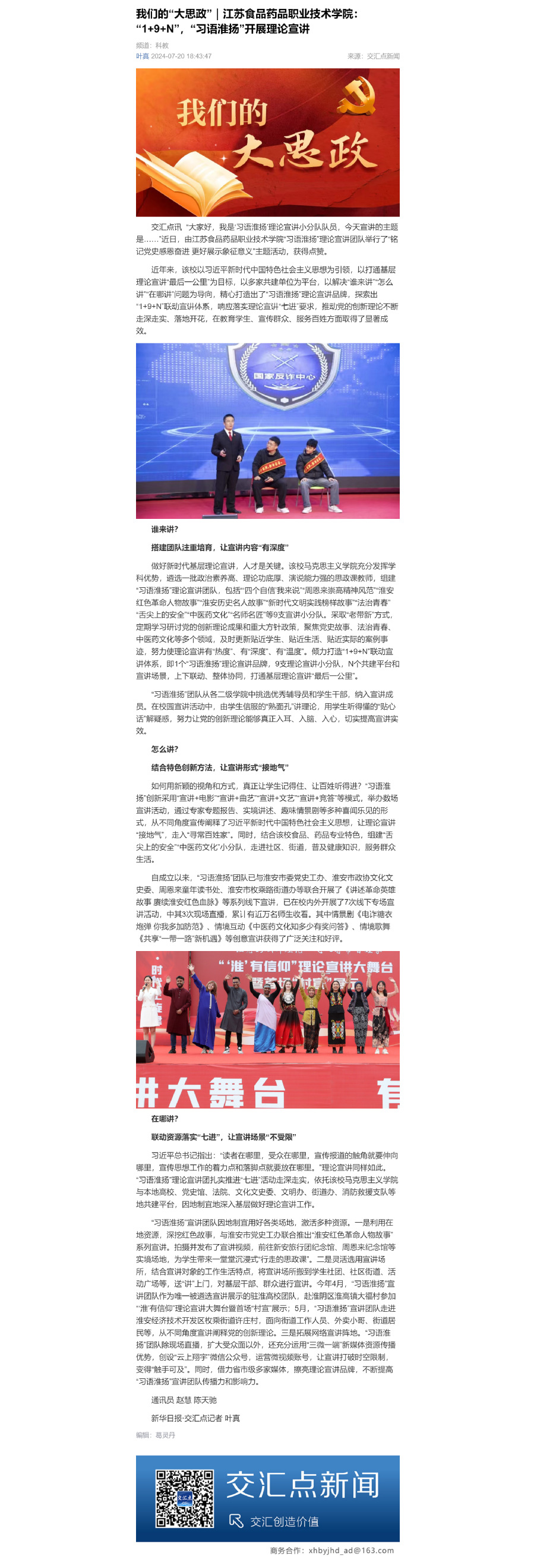 近年来,该校以习近平新时代中国特色社会主义思想为引领,以打通基层理论宣讲“最后一公里”为目标,以多家共建单位为平台,以解决“谁来讲”“怎么讲”“在哪讲”问题为导向,精心打造出了“习语淮扬”理论宣讲品牌,探索出“1+9+N”联动宣讲体系,响应落实理论宣讲“七进”要求,推动党的创新理论不断走深走实、落地开花,在教育学生、宣传群众、服务百姓方面取得了显著成效。