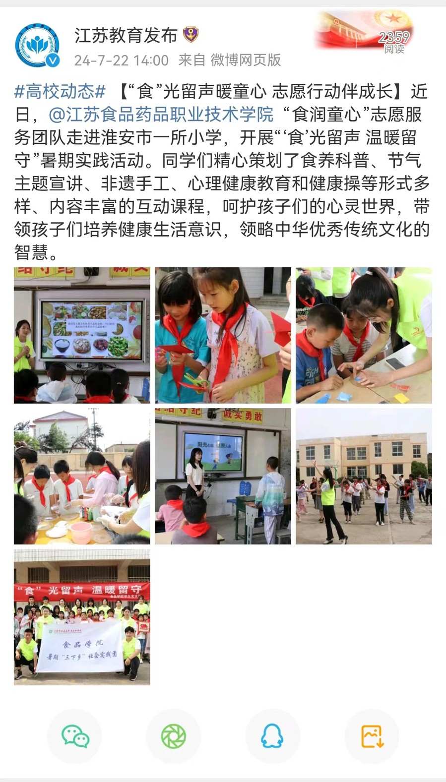 【“食”光留声暖童心 志愿行动伴成长】近日,@BBV电子·(中国)网站 “食润童心”志愿服务团队走进淮安市一所小学,开展“‘食’光留声 温暖留守”暑期实践活动。同学们精心策划了食养科普、节气主题宣讲、非遗手工、心理健康教育和健康操等形式多样、内容丰富的互动课程,呵护孩子们的心灵世界,带领孩子们培养健康生活意识,领略中华优秀传统文化的智慧。