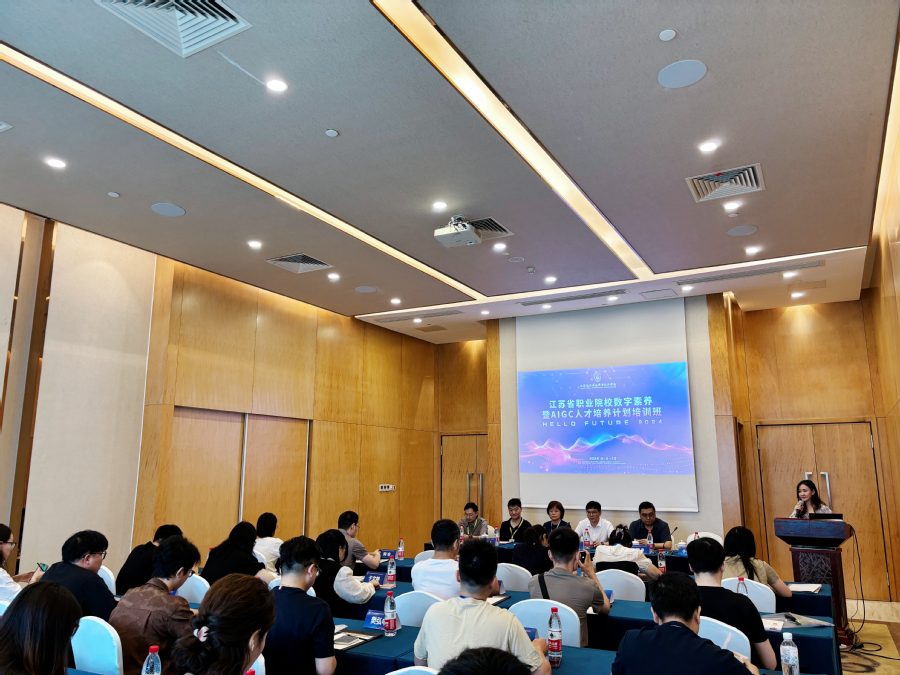 为贯彻落实教育部《教师数字素养》、中央网信办《提升全民数字素养与技能行动纲要》等文件精神,推进职业教育数字素养人才培养和专业建设,8月9日,由全国数字文化创意行业产教融合共同体、网易有道信息技术(杭州)有限公司主办,BBV电子·(中国)网站承办,江苏生涯教育科技有限公司协办的2024年江苏省职业院校教师数字素养暨AIGC人才培养计划培训班在淮安国联奥体明都酒店-惠风厅开班。BBV电子·(中国)网站党委委员、副校长焦宇知、人工智能学院院长张丹、东南大学教授姚莉、网易有道信息技术(杭州)有限公司产教融合总监李飞、江苏生涯教育科技有限公司总经理邓琳及来自江苏省各大高职院校的培训学员参加了开班仪式。仪式由人工智能学院副院长于春玲主持。