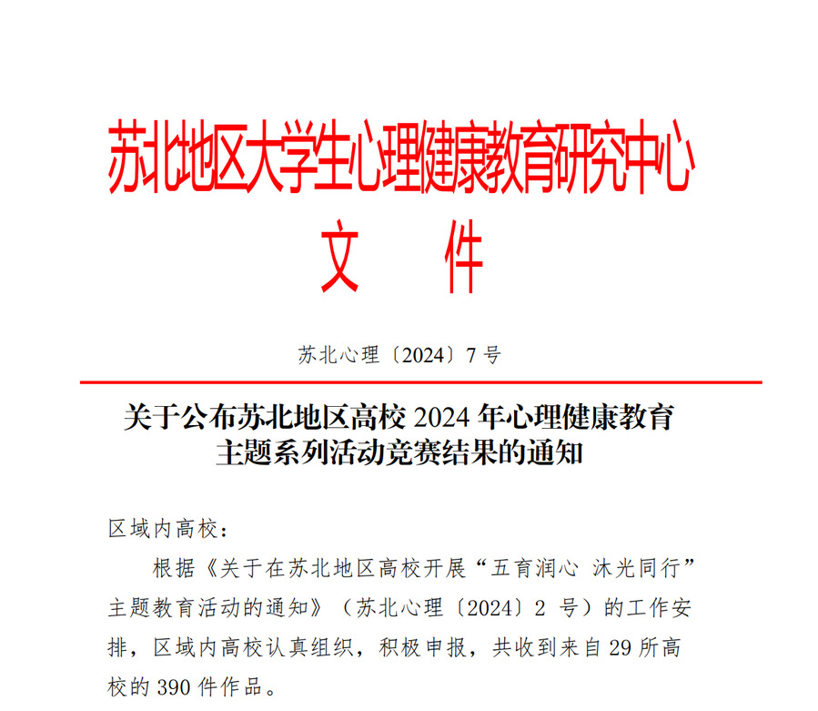 近日,苏北地区大学生心理健康教育研究中心公布了苏北地区高校2024年心理健康主题系列活动竞赛结果的通知。BBV电子·(中国)网站从29所高校的390件作品中脱颖而出,5件作品获奖,另有优秀组织奖1项。