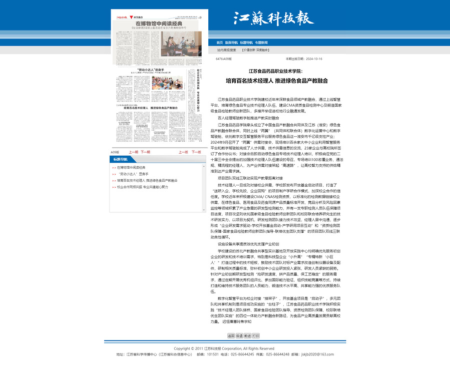 江苏食品药品学院牵头成立了中国食品产教融合共同体及江苏(淮安)绿色食品产教融合联合体,同时上线“两翼”(共同体和联合体)数字化运营中心和数字驾驶舱,依托数字交互智慧服务平台服务绿色食品这一淮安市千亿级支柱产业;2024年9月召开了“两翼”供需对接会,现场培训百余家大中小企业利用智慧服务平台和数字驾驶舱完成了人才供需、技术供需信息的交流,23家企业与高校院所签订了合作协议书;对接会后即启动绿色食品专场技术经理人培训,积极响应党的二十届三中全会提出的加强技术经理人队伍建设的号召,专场培训100名懂业务、通法规、精流程的经理人,为产业供需对接架起“高速路”,让高校智力支持的供给精准到达产业需求端。