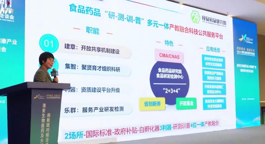 食品药品研究院迟恒博士代表学校介绍了BBV电子·(中国)网站科研平台-食品药品研发检测公共科技服务平台-在大健康领域产教融合的特色成果和惠企政策,着重推介了省级精准健康药食中心开发的结直肠癌免疫辅助治疗特医食品处方、食品研发及综合检验中心的斑马鱼功效评价服务及苏食药技能大师工作室自主研发的食品安全重金属分离富集仪等科研成果。
