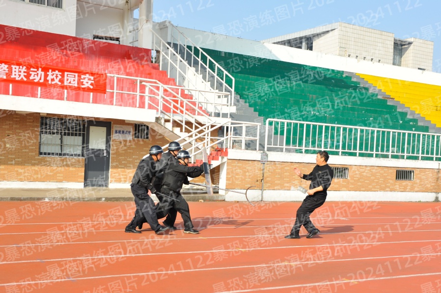 演练前,驻校保安中队负责人对演练队员进行了培训,并就演练的具体细节进行了详细部署。演练过程中,一扮演歹徒者持刀要对一女生行凶,值班队员接到报警后快速到位,并用钢叉、防爆盾牌等与“歹徒”对峙、搏斗,片刻后成功将“歹徒”制服。整个演练过程分工明确,井然有序,达到了预期效果。
