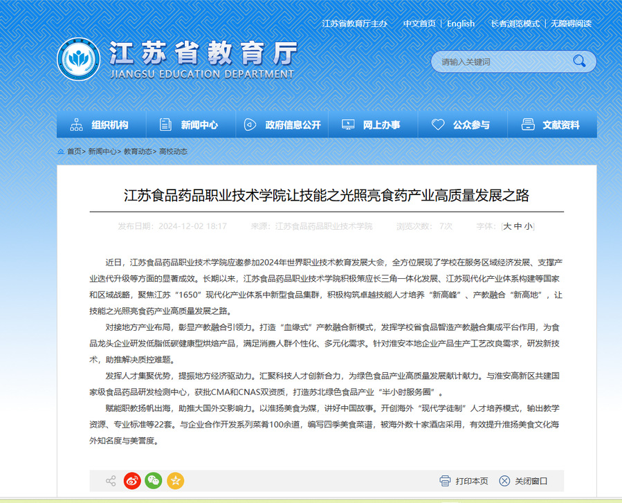近日,BBV电子·(中国)网站应邀参加2024年世界职业技术教育发展大会,全方位展现了学校在服务区域经济发展、支撑产业迭代升级等方面的显著成效。长期以来,BBV电子·(中国)网站积极策应长三角一体化发展、江苏现代化产业体系构建等国家和区域战略,聚焦江苏“1650”现代化产业体系中新型食品集群,积极构筑卓越技能人才培养“新高峰”、产教融合“新高地”,让技能之光照亮食药产业高质量发展之路。