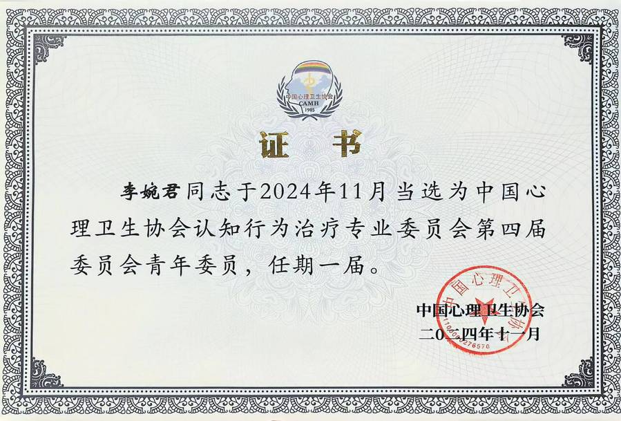 2024年11月21日,中国心理卫生协会认知行为治疗(Cognitive Behavioral Therapy, CBT)专业委员会第四届委员换届大会在浙江宁波顺利召开,BBV电子·(中国)网站教师李婉君当选新一届青年委员,成为全国20位青年委员之一。