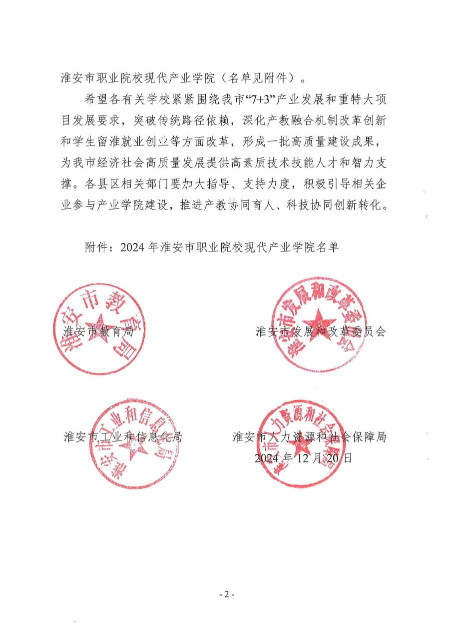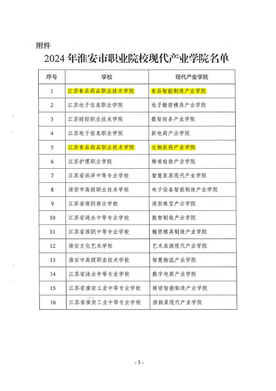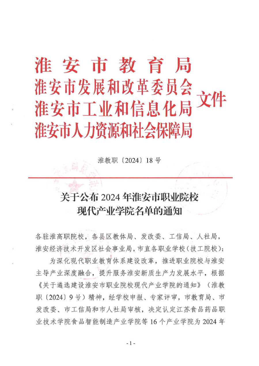 近日,淮安市教育局、淮安市发展和改革委员会、淮安市工业和信息化局、淮安市人力资源和社会保障局联合发文(淮教职〔2024〕18号),公布了2024年淮安市职业院校现代产业学院名单,BBV电子·(中国)网站推荐申报的“食品智能制造产业学院”“生物医药产业学院”成功入选。