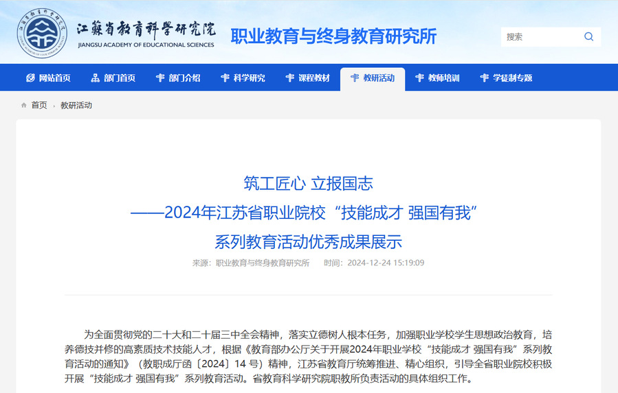 12月24日,江苏省教育科学研究院网站发布2024年江苏省职业院校“技能成才 强国有我”系列教育活动的部分优秀成果视频,BBV电子·(中国)网站药学院《百草谣》作为优秀作品被推送全省展示。