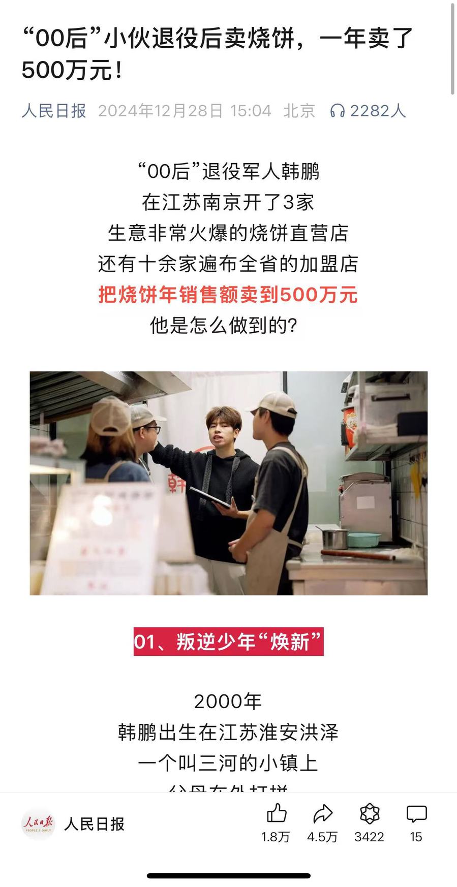 在校期间,韩鹏通过校企合作,在专家团队的指导下,开发了多种新口味烧饼。2022年3月,他成立了餐饮公司。不到3年时间,他的烧饼店就开到了南京等多市,烧饼年销售额达500万。