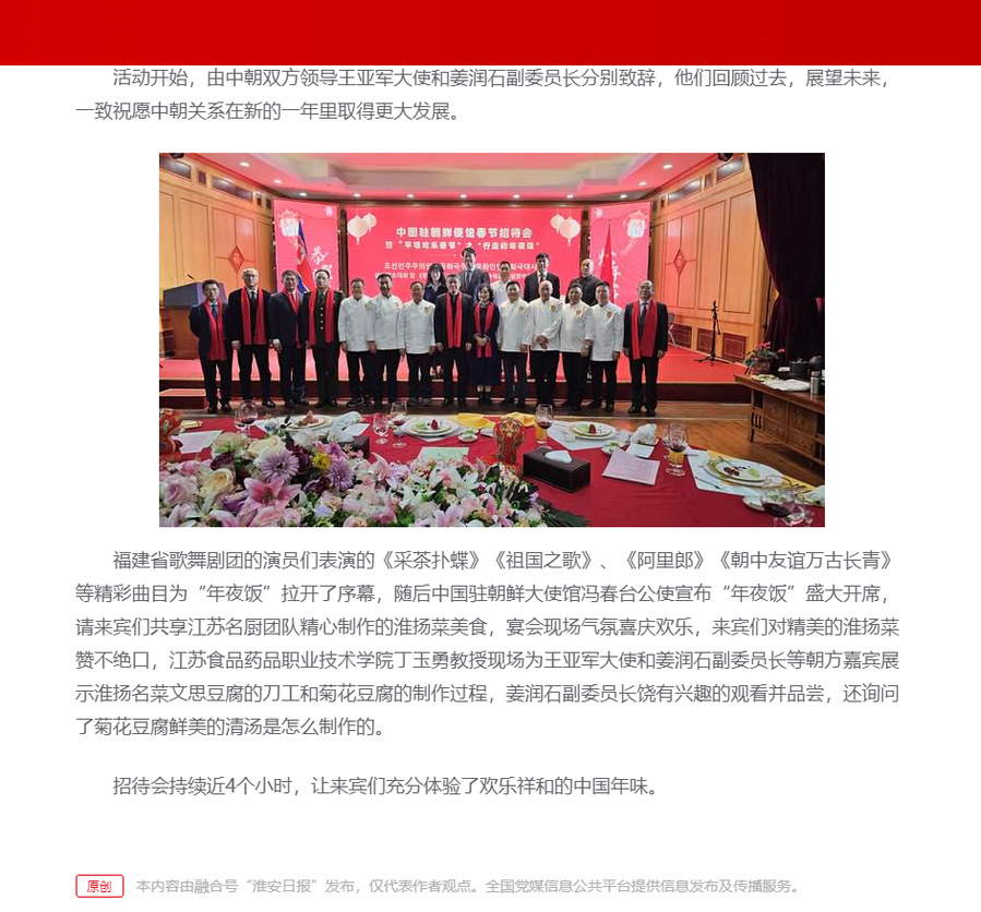 2025年1月25日晚,中国驻朝鲜大使馆王亚军大使和夫人在使馆举办春节招待会暨“平壤欢乐春节”之“行走的年夜饭”。由世界中餐业联合会组织的江苏厨师团队负责了年夜饭的制作。