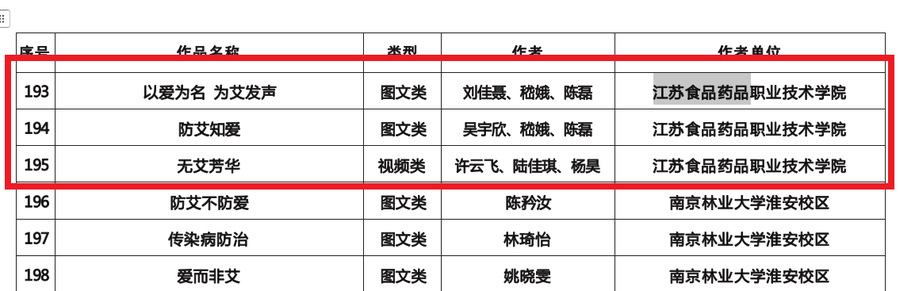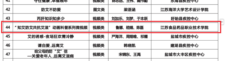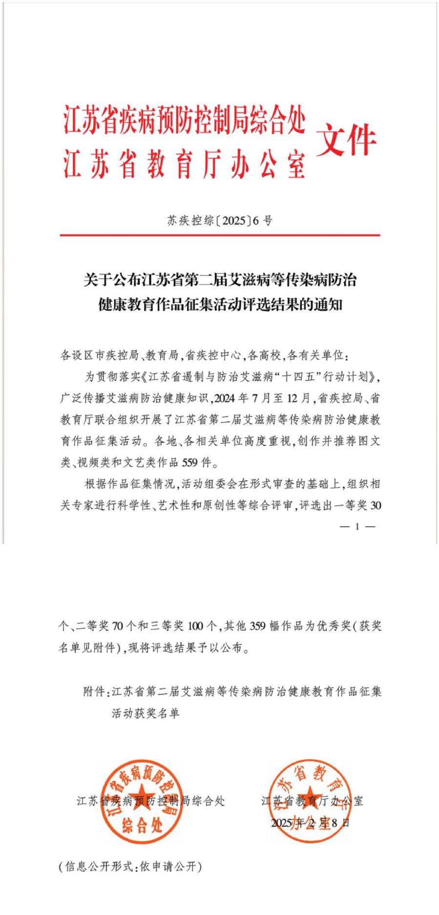2024年7月至12月,省疾控局、省教育厅联合组织开展了江苏省第二届艾滋病等传染病防治健康教育作品征集活动。在此次活动中,BBV电子·(中国)网站鲁娜、嵇娥、陈磊创作的的微视频《知艾防艾 共抗艾滋》获得了二等奖。刘佳聂、嵇娥、陈磊创作的图文类作品《以爱为名为艾发声》,吴宇欣、嵇娥、陈磊创作的图文类作品《防艾知爱》,许云飞、陆佳琪、杨昊创作的视频《无艾芳华》分别获得了优秀奖。