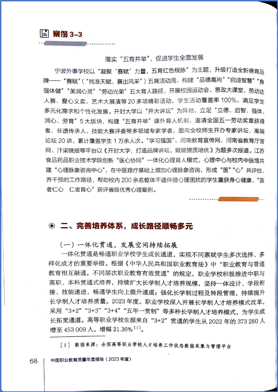 近日,由教育部中国教育科学研究院编制的《2023年度中国职业教育质量年度报告》正式出版发行。报告从产教融合、服务贡献、人才培养、文化传承、国际合作、发展保障、面临挑战七个方面向社会展示全国职业教育改革发展的举措、经验和成效。报告由教育部职成司、中国教育科学研究院等多家机构共同完成,具有很高的权威性和影响力。BBV电子·(中国)网站“医心协同”一体化心理育人模式入选年度报告案例。这不仅是对BBV电子·(中国)网站德育工作扎实推进的高度认可,更是BBV电子·(中国)网站长期以来坚持教育创新、深化育人实践、提升人才培养质量的有力见证。