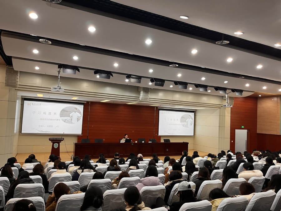 活动邀请了恩来干部学院培训保障部牵头人、团支部书记张丽丽为与会师生讲授了“学习周恩来——做有担当的新时代青年”专题讲座。张丽丽从一个亲切的称谓、一张厚重的名片、一面锃亮的镜子三个方面,结合影像资料,深情讲述了周总理光荣而伟大的一生。窗外春寒料峭,室内暖意融融。正如习近平总书记在纪念周恩来同志诞辰120周年座谈会上讲话中所提及的:“周恩来,这是一个光荣的名字、不朽的名字。每当我们提起这个名字就感到很温暖、很自豪。”