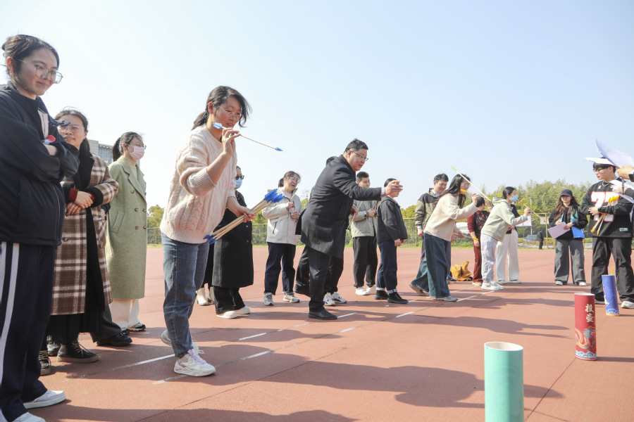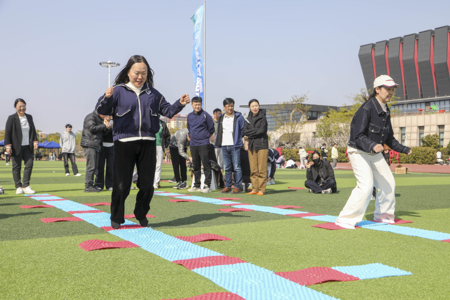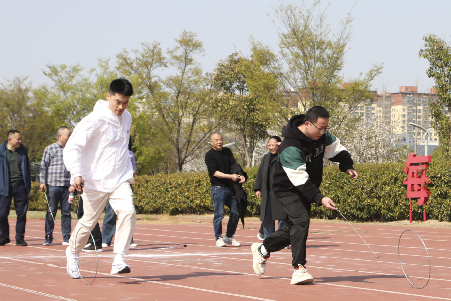 本次运动会设置滚铁环、投壶、九宫之义等13个兼具趣味性与竞技性的项目,涵盖单人赛与团体赛。教职工们化身“运动达人”,在“摸石过河”中展现智慧与敏捷,在“充气毛毛虫”比赛中演绎团队协作,在“车轮滚滚”项目中诠释凝聚力。本次运动会团体项目特别设置中层干部参与要求,与教职工同场竞技,以实际行动践行“干部带头、全员参与”的作风建设要求。