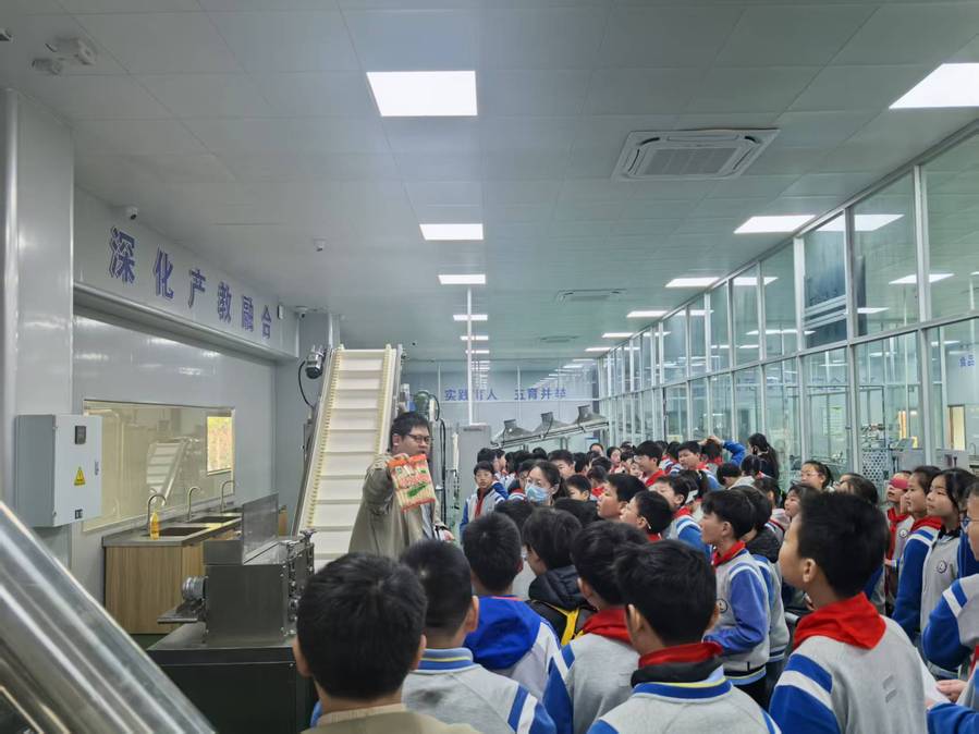 500名五年级学生在马克思主义学院10位教师、淮安市天津路小学10位教师的带领下,分成5个小组,先后有序地走进了食品学院的烘焙车间、膨化车间、纯净水智能生产线,健康医学院的啤生产车间、白酒生产车间,数字经济学院的京东数字产业学院,以及校史馆、食品药品科技馆。小学生们一边聆听BBV电子·(中国)网站老师们的讲解,一边充满好奇地注视着每一个实验实训器材、大学生们的实训操作,以及校史馆、食品药品科技文化馆里展示的历史画面。天津路小学的师生们异口同声地表示收益颇丰。