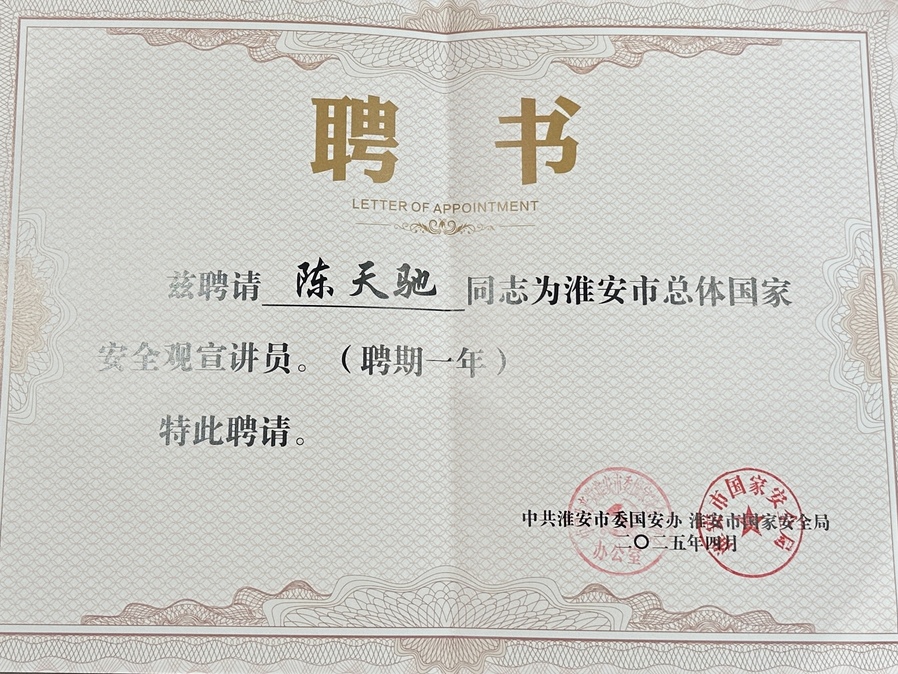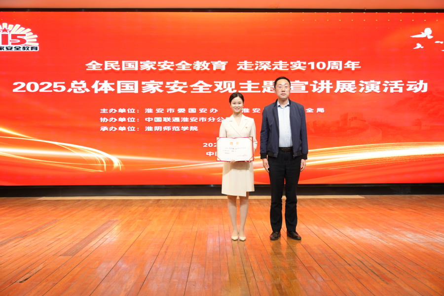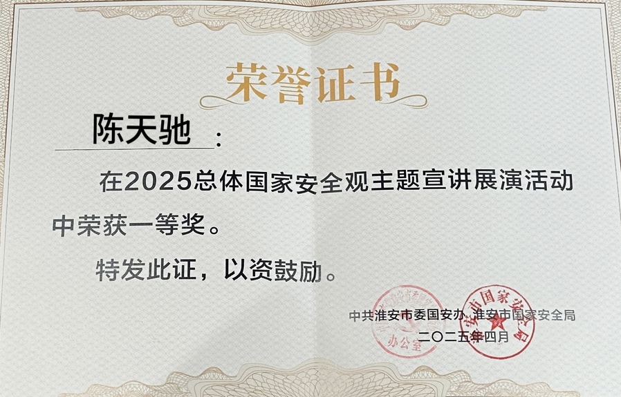 本次全市比赛分为预赛和决赛,大中专院校组、企事业组、县区组共30名选手参加预赛,角逐出前10名参加决赛。陈天驰以大中专院校组第一名的预赛成绩进入决赛并将作为淮安市唯一代表选手参加江苏省“总体国家安全观”宣讲比赛。