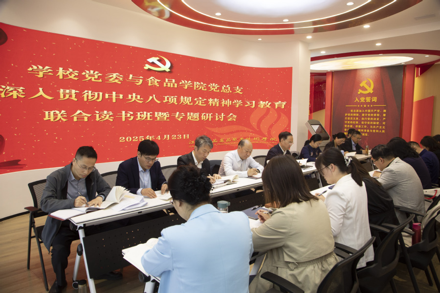 本次读书班采用集体学习、交流研讨、现场研学、联合学习、专题调研等多种形式开展。党委班子成员分别领学《习近平关于加强党的作风建设论述摘编》一到九章内容,通过原原本本研读,准确把握原文原理,深入领会精髓要义。在4月18日的专题读书班上,吸纳全体中层干部参加学习,扩大学习覆盖面。4月23日、25日,学校党委先后与食品学院党总支、机关党委开展联合读书班暨专题研讨会,围绕“转变工作作风,推动高质量发展”主题,开展现场调研,征求意见建议。4月25日,学校党委深入贯彻中央八项规定精神学习教育专题读书班赴周恩来五德教育馆进行现场研学,学习周恩来崇高精神风范和优良作风。读书班期间,党委班子成员及党务部门负责人均围绕党的作风建设作重点发言,结合分管工作和自身实际交流学习体会,剖析存在问题和改进措施。