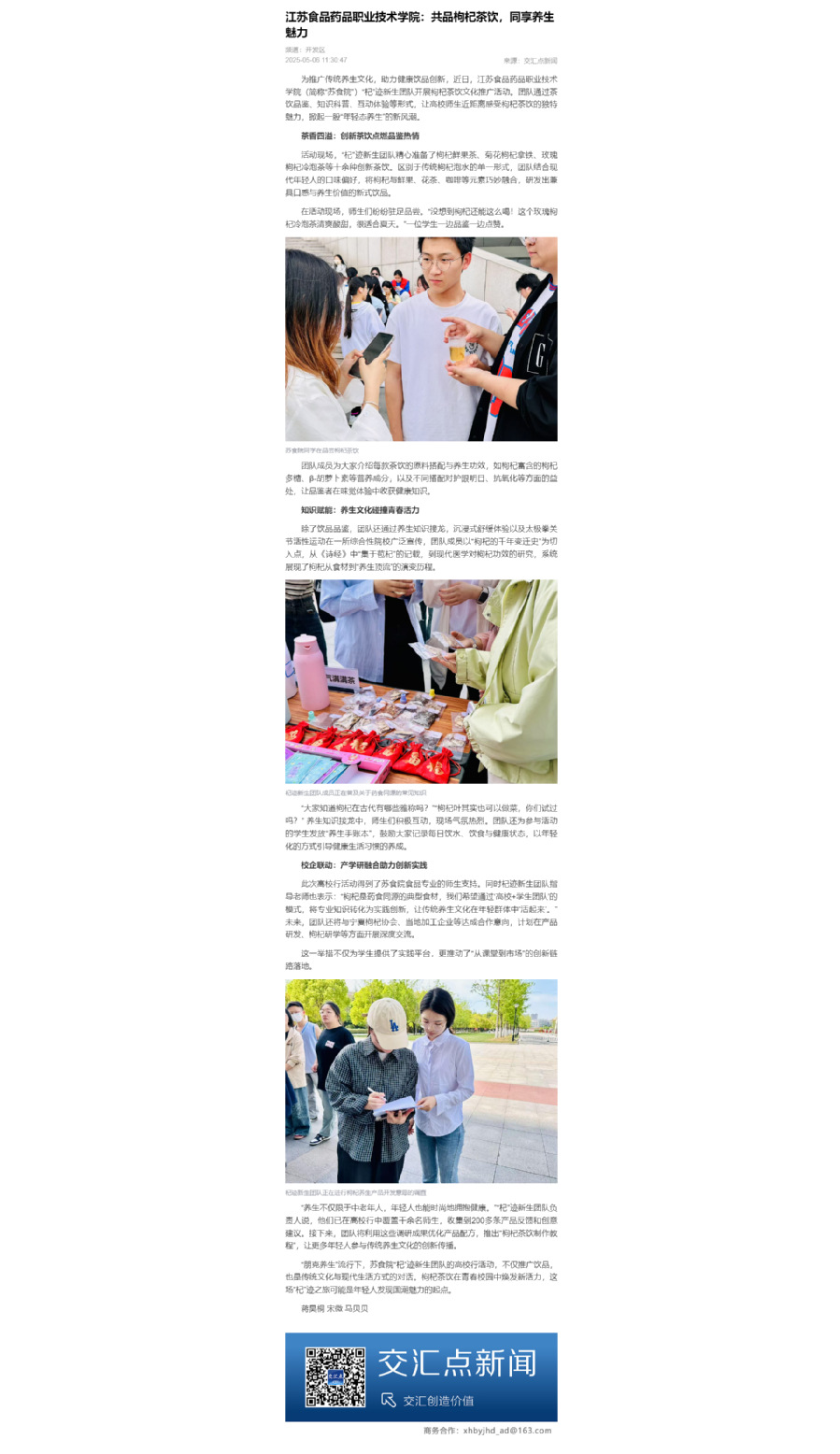 此次高校行活动得到了苏食院食品专业的师生支持。同时杞迹新生团队指导老师也表示:“枸杞是药食同源的典型食材,我们希望通过‘高校+学生团队’的模式,将专业知识转化为实践创新,让传统养生文化在年轻群体中‘活起来’。”未来,团队还将与宁夏枸杞协会、当地加工企业等达成合作意向,计划在产品研发、枸杞研学等方面开展深度交流。