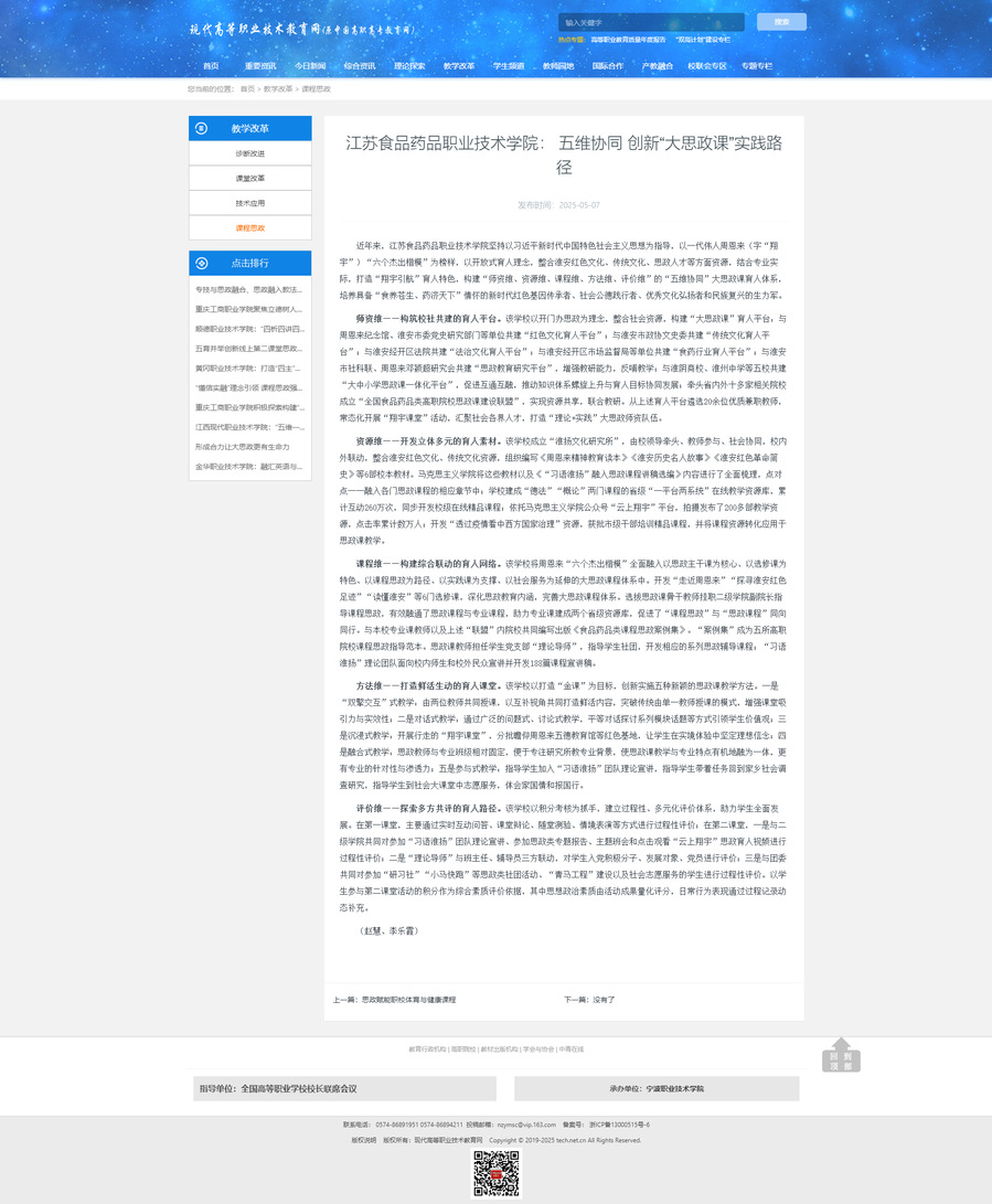 课程维——构建综合联动的育人网络。该学校将周恩来“六个杰出楷模”全面融入以思政主干课为核心、以选修课为特色、以课程思政为路径、以实践课为支撑、以社会服务为延伸的大思政课程体系中。开发“走近周恩来”“探寻淮安红色足迹”“读懂淮安”等6门选修课,深化思政教育内涵,完善大思政课程体系。选拔思政课骨干教师挂职二级学院副院长指导课程思政,有效融通了思政课程与专业课程,助力专业课建成两个省级资源库,促进了“课程思政”与“思政课程”同向同行。与本校专业课教师以及上述“联盟”内院校共同编写出版《食品药品类课程思政案例集》。“案例集”成为五所高职院校课程思政指导范本。思政课教师担任学生党支部“理论导师”,指导学生社团,开发相应的系列思政辅导课程;“习语淮扬”理论团队面向校内师生和校外民众宣讲并开发188篇课程宣讲稿。