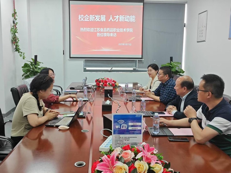 在南京同仁堂交流座谈会上,安进全面介绍了学校办学历史、学科体系、专业特色及人才培养模式,重点阐释了学校在专业动态调整、实践教学强化等方面的改革举措。企业代表王业盈对学校一行到来表示热烈欢迎,并高度赞誉学校毕业生综合素养:“贵校毕业生专业技术扎实、职业态度端正,多次荣获公司先进个人称号,已成为企业生产、管理的骨干力量。”许云飞副院长围绕学院省高水平专业群建设,系统汇报了课程体系重构、产教融合实训基地建设及“双师型”师资培养成果。三位南京同仁堂在职校友结合自身成长经历,从岗位技能需求、职业发展规划等维度为学校人才培养提出建议,现场互动气氛热烈。
