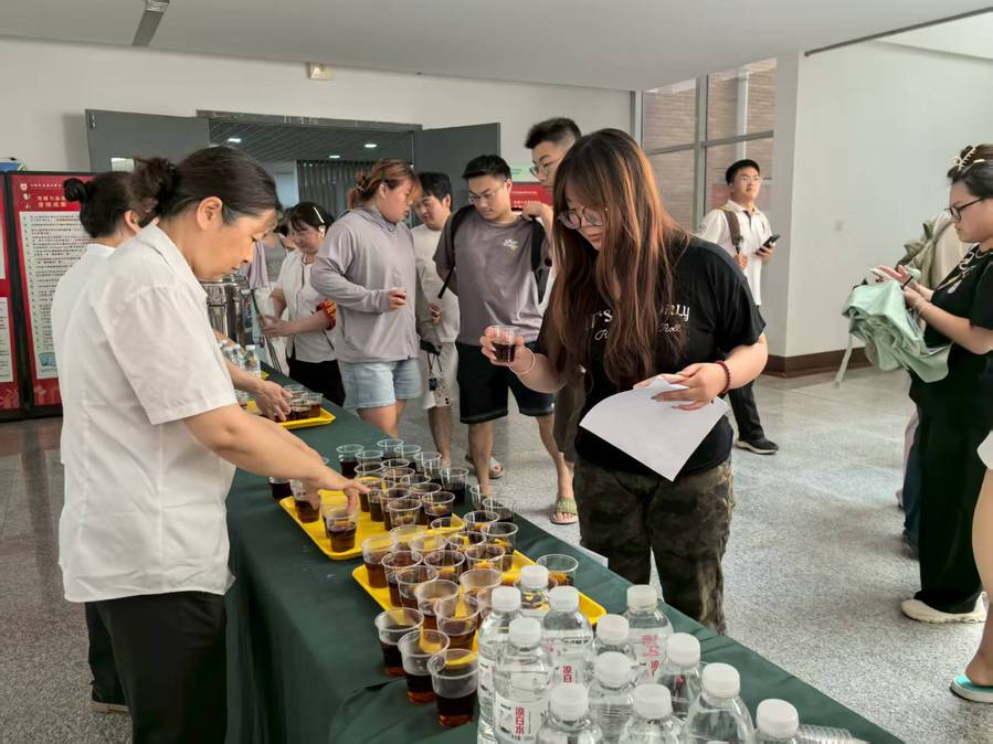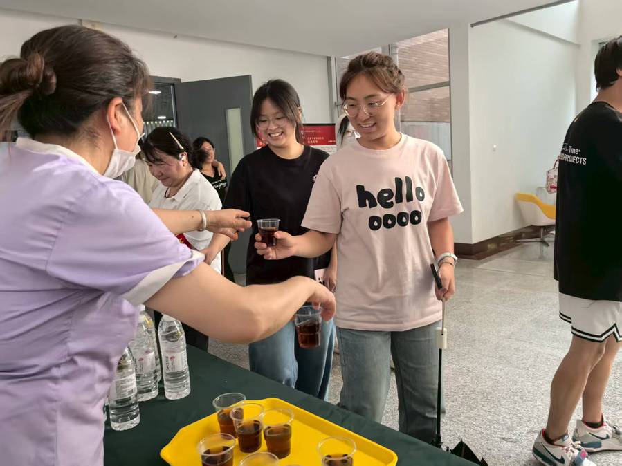 活动期间,师生和工作人员们有序来到补给点,接过一杯杯解暑的酸梅汤,脸上洋溢着幸福的笑容。大家分享这份甘甜并向现场工作人员表达由衷的感谢,欢声笑语不时在大厅里响起。此外,现场还贴心准备了藿香正气口服液、人丹等专业防暑物资,可随时向值班人员免费领取,为应对高温天气提供了全方位的健康保障。