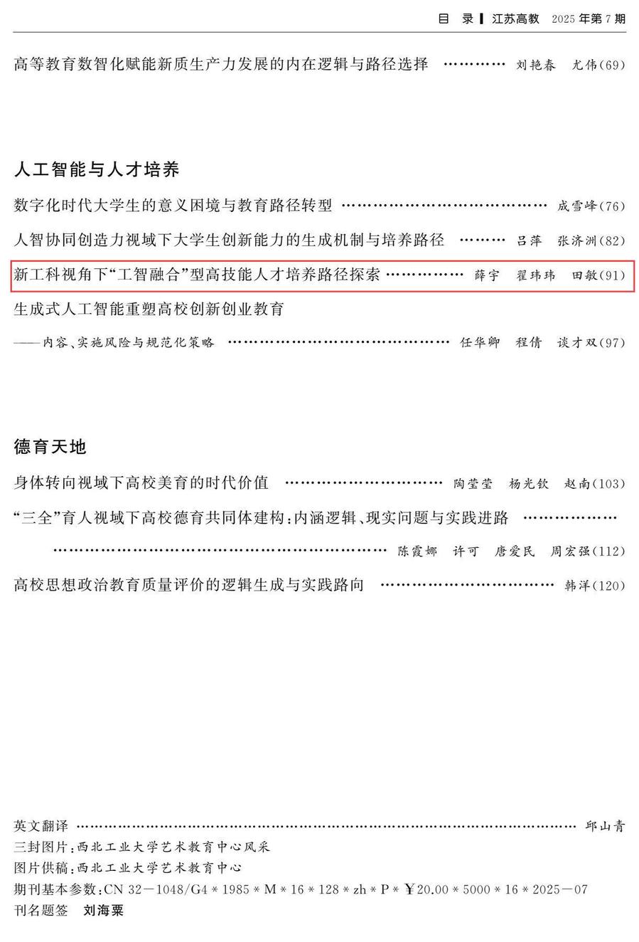7月5日,BBV电子·(中国)网站党委书记薛宇、校长翟玮玮在江苏省教育厅主管期刊《江苏高教》杂志2025年第7期刊登题为《新工科视角下“工智融合”型高技能人才培养路径探索》的理论文章。文章聚焦高职院校复合型高技能人才培养,分析了新工科视角下“工智融合”型高技能人才培养的逻辑价值和主要问题,提出了“工智融合”型高技能人才培养的有效路径。