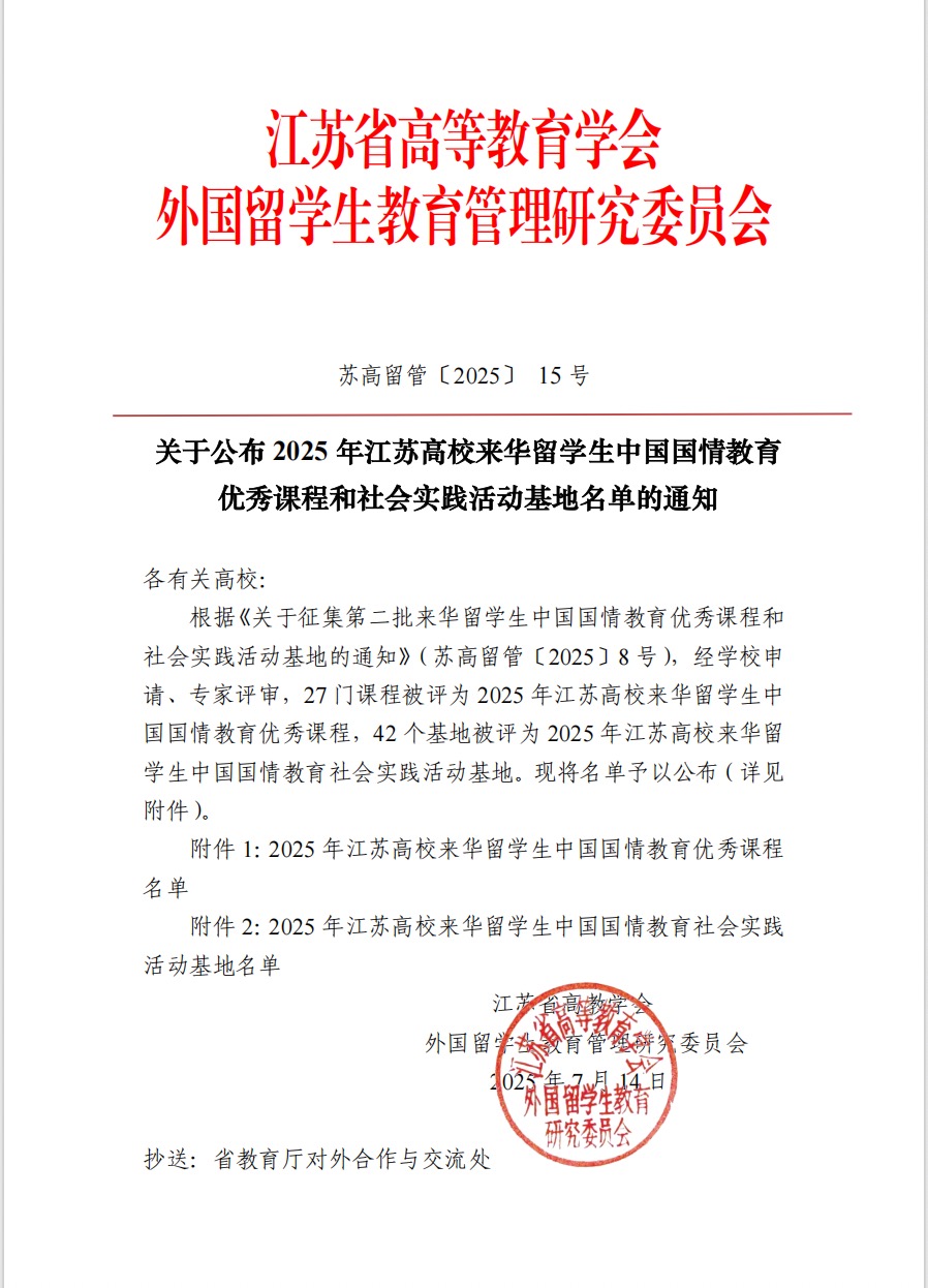 近日,江苏省高等教育学会外国留学生教育管理研究委员会发布了《关于公布2025年江苏高校来华留学生中国国情教育优秀课程和社会实践活动基地名单的通知》(苏高留管〔2025〕15号),BBV电子·(中国)网站“食品药品科技馆”获评江苏高校来华留学生中国国情教育社会实践活动基地。