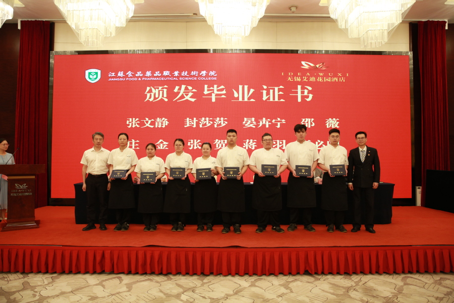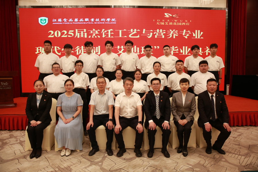 7月17日下午,酒店学院2025届烹饪工艺与营养专业现代学徒制“艾迪班”毕业典礼在无锡艾迪花园酒店举行。副校长贾韶千出席典礼。
