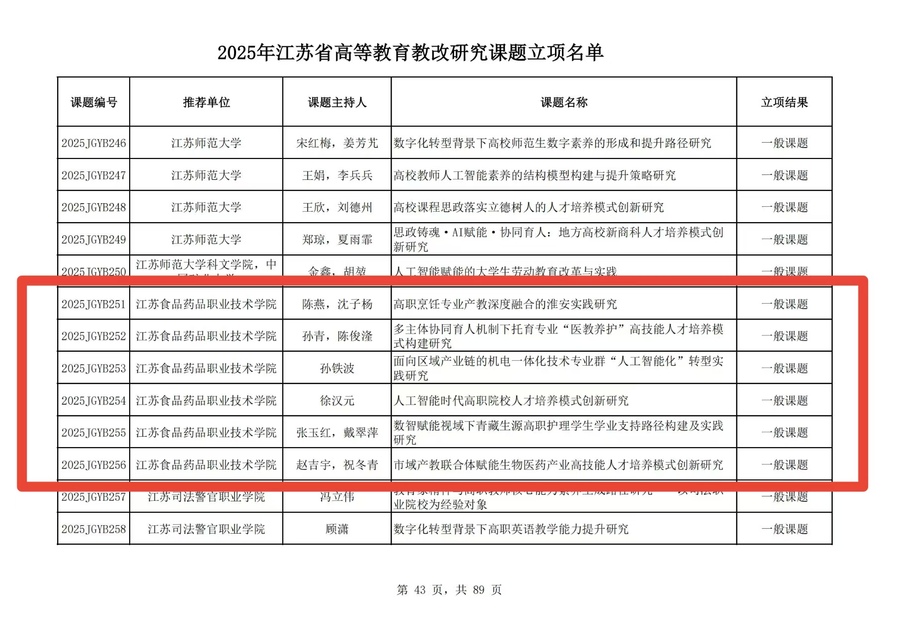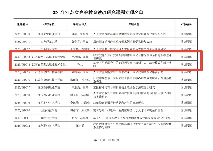 此次立项的课题中共包括重中之重课题1项、重点课题2项、一般课题6项,具体如下:刘杰、翟玮玮主持的《产业智改数转背景下高职院校人才培养体系研究——以高职食品智能加工技术专业群为例》获批重中之重课题;李思阳、郭娜主持的《职业教育行业产教融合共同体实体化运作标准体系构建及推进路径研究》、孙兰主持的《基于“四元融合”的高职药学类“双创”人才培养模式创新与实践》获批重点课题;陈燕、沈子杨主持的《高职烹饪专业产教深度融合的淮安实践研究》,孙青、陈俊湰主持的《多主体协同育人机制下托育专业“医教养护”高技能人才培养模式构建研究》,孙铁波主持的《面向区域产业链的机电一体化技术专业群“人工智能化”转型实践研究》,徐汉元主持的《人工智能时代高职院校人才培养模式创新研究》,张玉红、戴翠萍主持的《数智赋能视域下青藏生源高职护理学生学业支持路径构建及实践研究》,赵吉宇、祝冬青主持的《市域产教联合体赋能生物医药产业高技能人才培养模式创新研究》获批一般课题。