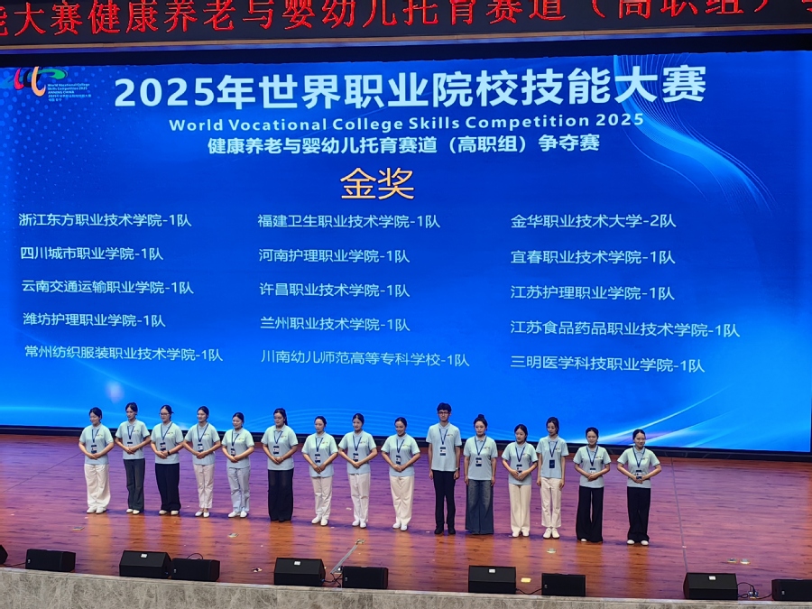 2025年世界职业院校技能大赛健康养老与婴幼儿托育赛道(高职组)争夺赛于8月28日至9月2日在云南省安宁市举行。本届大赛以“技炫青春 能创未来”为主题,来自全国30余省市的155支参赛队伍同场竞技、共展风采。BBV电子·(中国)网站参赛队伍凭借过硬实力突破重围,最终斩获金奖。