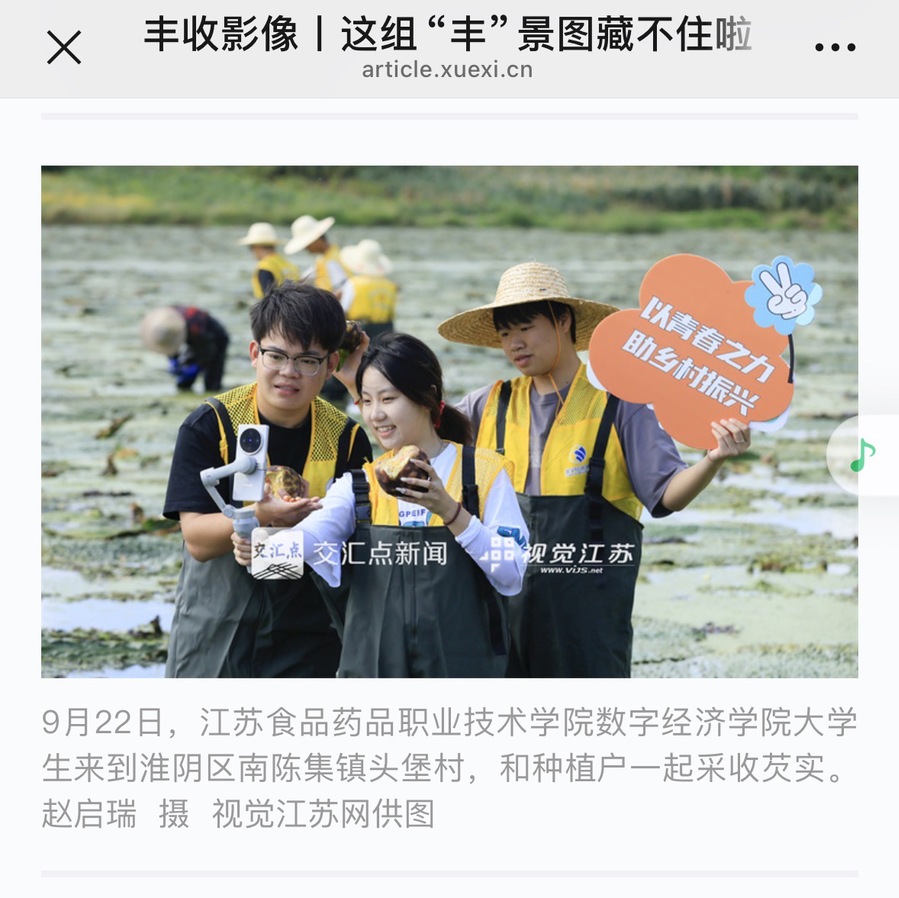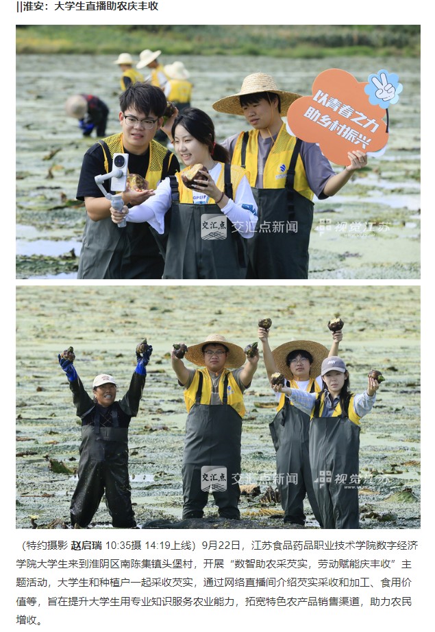 9月22日,BBV电子·(中国)网站数字经济学院大学生来到淮阴区南陈集镇头堡村,开展“数智助农采芡实,劳动赋能庆丰收”主题活动,大学生和种植户一起采收芡实,通过网络直播间介绍芡实采收和加工、食用价值等,旨在提升大学生用专业知识服务农业能力,拓宽特色农产品销售渠道,助力农民增收。