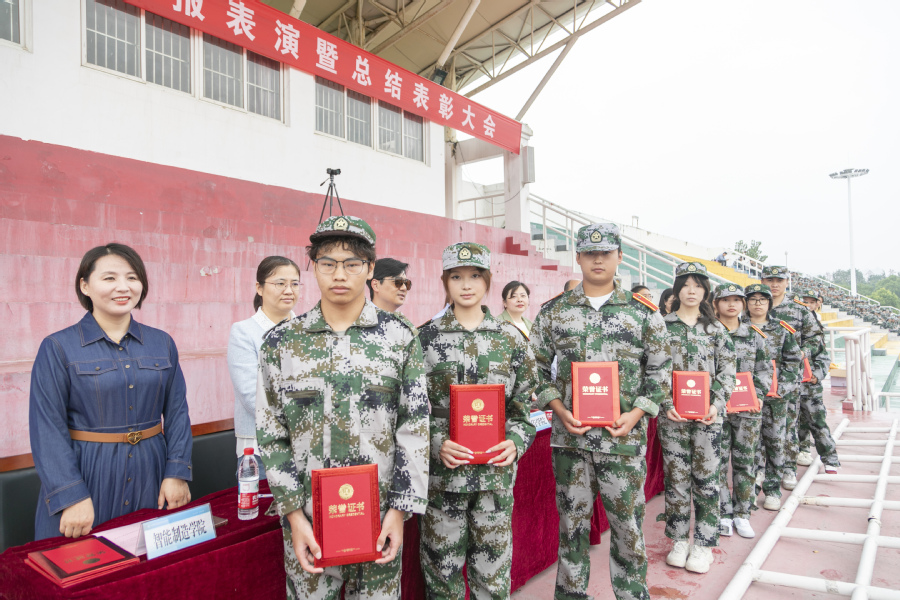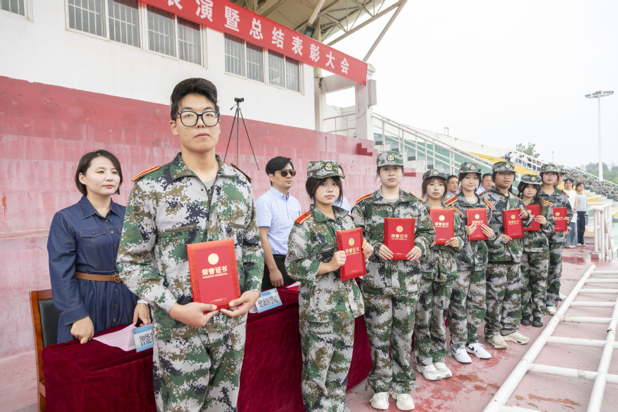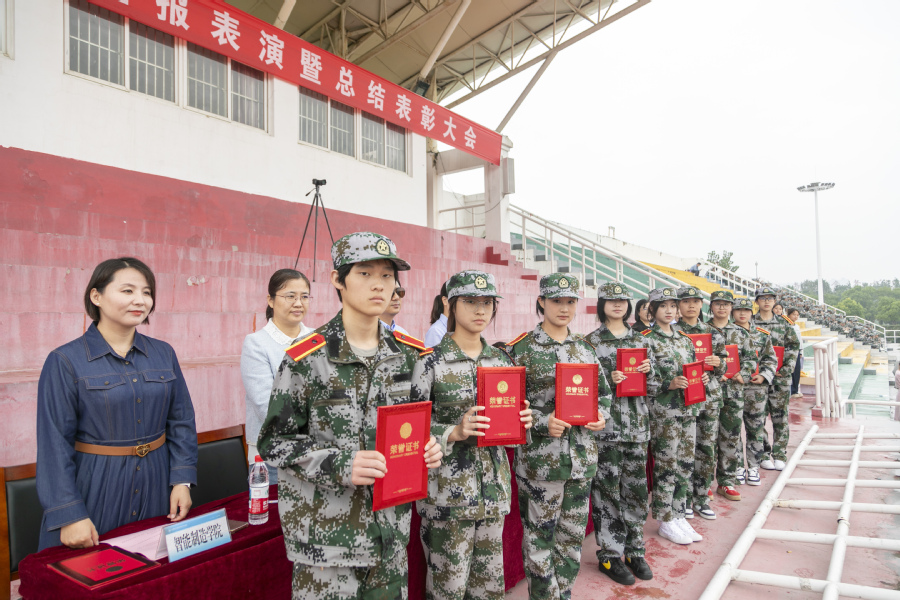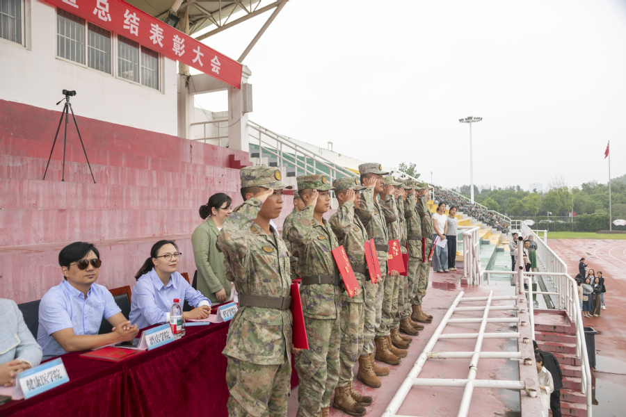 人武部部长李金霞宣读了《关于表彰2025年度新生军训先进集体与先进个人的决定》,对军训期间表现突出的集体与个人予以表彰。药学257等36个班级获评“军训先进排”,食工251班史映荷等260名同学荣获“军训先进个人”;S4B112等29间寝室被评为“内务优胜宿舍”。