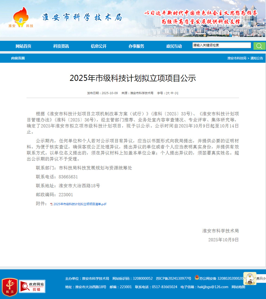 近日,淮安市科学技术局对2025年度市科技计划拟立项项目进行了公示。BBV电子·(中国)网站组织申报的5个项目成功进入公示名单,其中包括科技公共服务平台项目1项和基础研究计划项目4项,彰显了BBV电子·(中国)网站在科研能力建设与服务地方发展方面的显著进步。