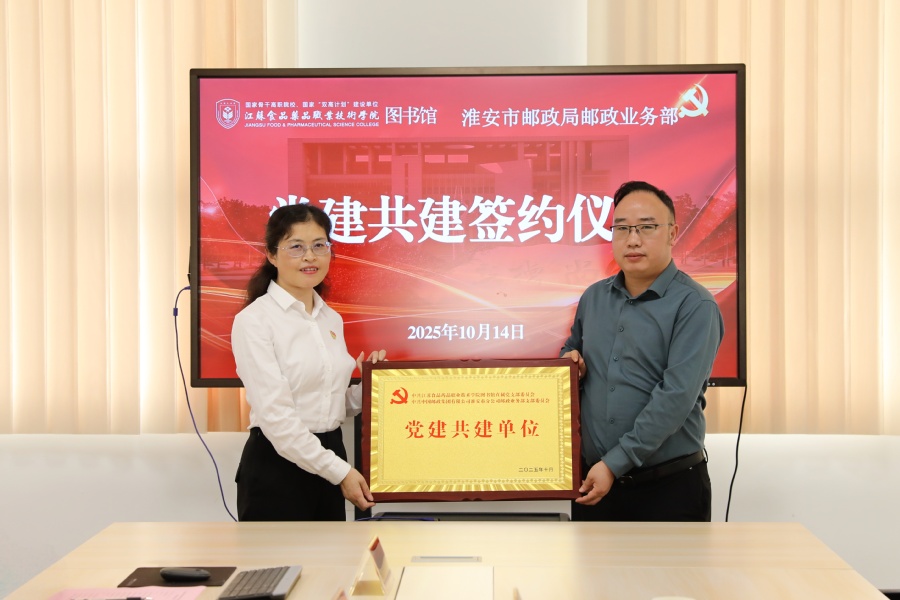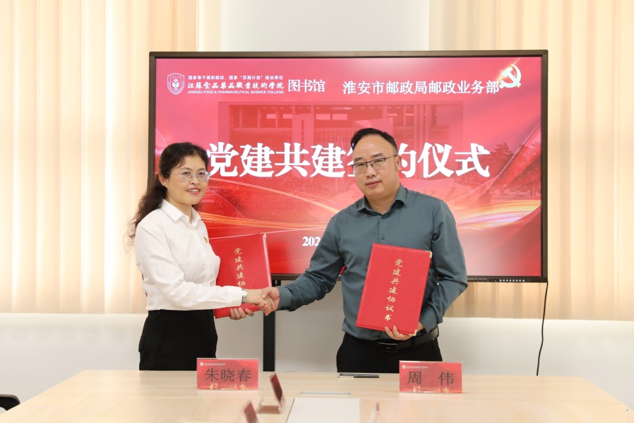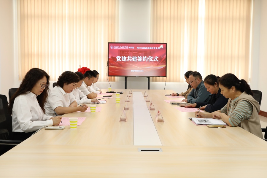 会上,周伟与淮安市邮政局邮政业务部党支部书记朱晓春共同宣读《基层党组织结对共建协议书》,明确双方将通过组织共建、活动共联、资源共享等方式,在理论学习、红色文化传播、志愿服务、书香校园建设等领域开展深度合作。协议签署后,双方代表共同为“党建共建单位”揭牌,标志着两家单位党建共建工作正式启动。