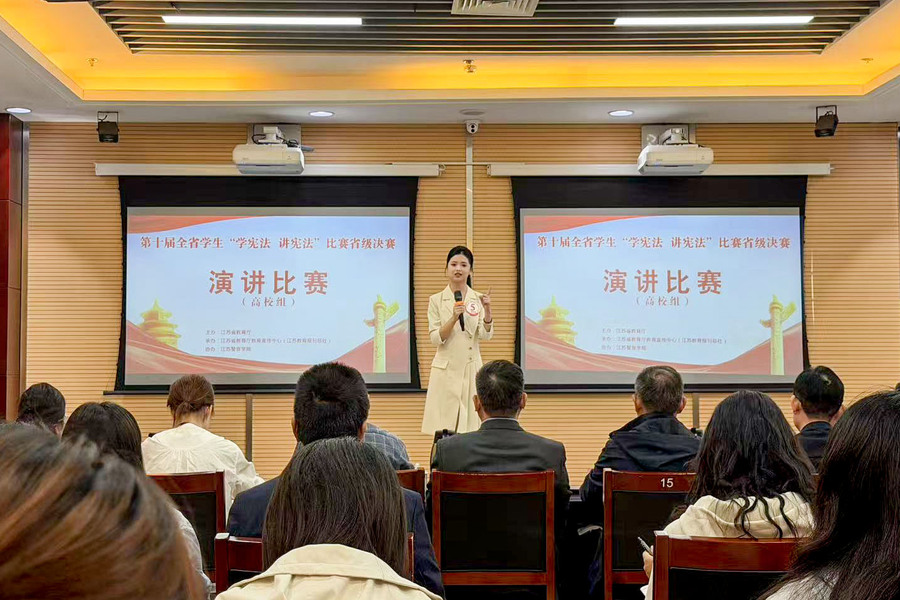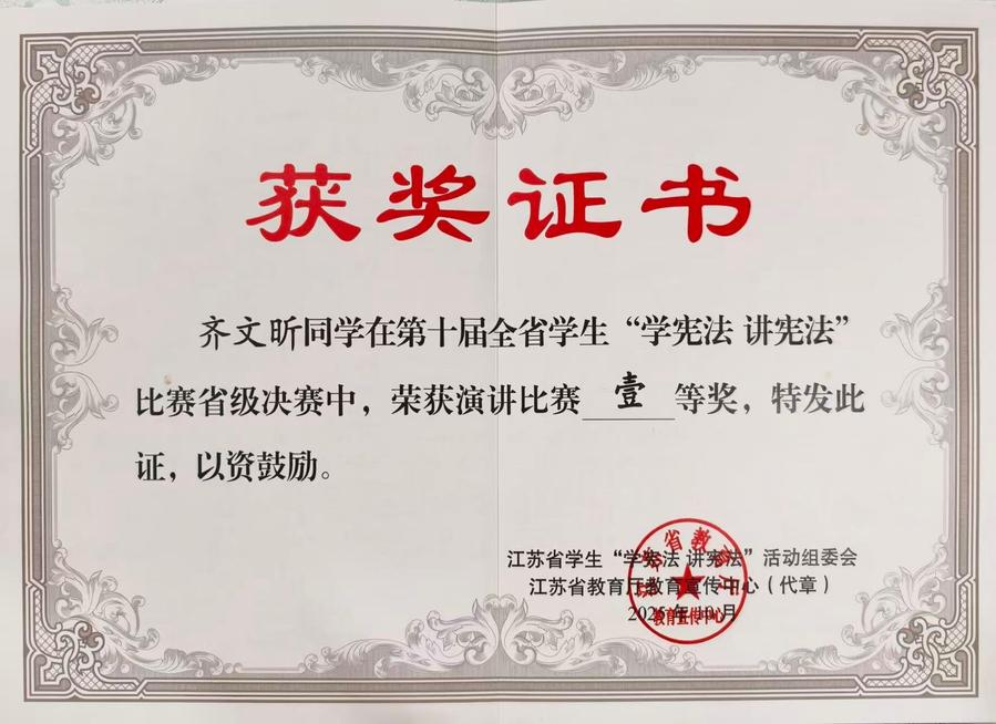 本次比赛由江苏省教育厅统一部署,决赛分为主题演讲与即兴演讲两个环节。在主题演讲环节,齐文昕同学以《以青春之名,赴宪法之约》为题,声情并茂、以思促讲,赢得了评委的一致好评;在即兴演讲环节,她沉着冷静、思路清晰,围绕《中华人民共和国民营经济促进法》中的法律实践以及社会影响力展开深入论述,逻辑严密、语言流畅,充分彰显了BBV电子·(中国)网站学子对宪法精神的深刻理解与出色的践行能力。